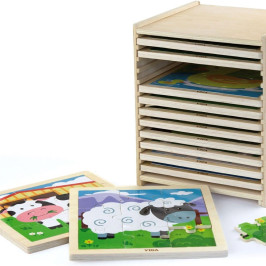 Boite de rangement + 12 puzzles 1er âge de 4 pièces. Spécial collectivités. Atelier pour 12 enfants. Contenu : 1 boite de rangement et 12 puzzles à cadre de 4 pièces en bois épais. Dessins naïfs et colorés sur le thème des animaux qui attirent la curiosité des enfants. Puzzle pour développer le sens de l'observation, la logique et l'habileté manuelle des tout-petits. ...